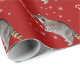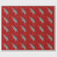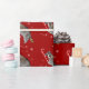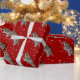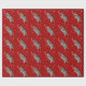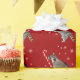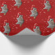 Envuelva sus presentes con un mapache adorable que come un bastón de caramelo gigante rodeado por los copos de nieve en un fondo rojo.