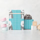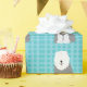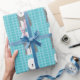 Perro pastor inglés viejo caprichoso y adorable con el papel de embalaje azul de los lunares