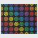 Los lunares coloreados arco iris con los círculos negros dentro de ellos dan la mirada de un diseño de la diana contra un fondo negro.