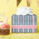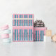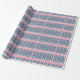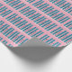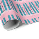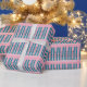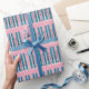 Esquíes azules sobre fondo rosado con Navidades de nieve envolviendo papel.