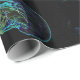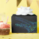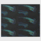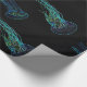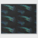 Marisco de neón brillante de color turquesa y azul con un toque de verde, nadando sobre un fondo negro.