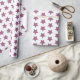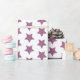 Papel de envolvimiento con estampados finos con estrellas moradas sobre un fondo blanco. Perfecto para envolver una ducha de bebé chica o regalos de cumpleaños. Diseñado por Patricia Alvarez.