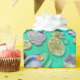 pasteles, dulces y té con otros deliciosos alimentos de fondo verde azulado brillante.