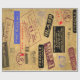 Diferentes tipos de sellos de viaje y franqueo en un fondo de papel marrón.
