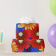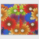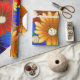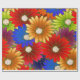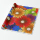 Papel de envolvimiento floral animado y caleidoscópico con margaritas sobredimensionadas en tonos rojos, naranjas, azules, morados y verdes. Las flores, alineadas con detalles dorados, crean un efecto texturado y bordado a mano que se siente festivo y artístico. Perfecto para cumpleaños, celebraciones de primavera o para cualquiera que piense que la sutileza está sobrevalorada.