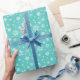 Navidades hermosos y simples envuelven papel con copos de nieve blancos en un fondo verde azulado. Perfecto para envolver sus regalos o sus pedidos esta próxima temporada de vacaciones. Diseñado por Patricia Alvarez