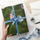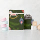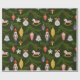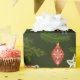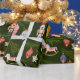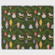 Este diseño vintage de envoltura de regalo trae todas esas vibraciones nostálgicas de antaño. La envoltura de regalo tiene un fondo verde oscuro con ramas de árbol verde perenne rodeadas de adornos de vidrio vintage en rosa pastel y azul con un toque de oro.