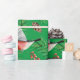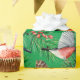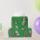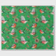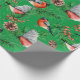 El papel de envoltura festivo incluye aves de bullfinch rojas con conos de pino y ramas siempre verdes sobre fondo verde.