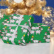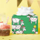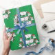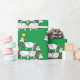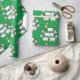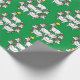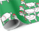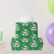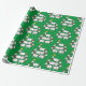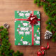 Este caprichoso envoltorio de regalo de vacaciones incluye cabras dibujadas a mano en sombreros de Santa, amontonadas unas sobre otras con una estrella de oro encima, sobre un fondo verde.