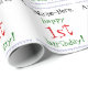 Este diseño de papel de envolvimiento personalizado y de cumpleaños de personalizable presenta un mensaje como "A-Name-Here, happy 1st cumpleaños!", donde el nombre y el número de cumpleaños pueden ser personalizados. También presenta formas de triángulo decorativas. El fondo es blanco. El envolvimiento de papel como este podría ser usado para envolver regalos que se dan para celebrar el cumpleaños de alguien. [~Z0000243]
