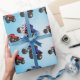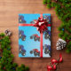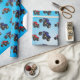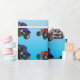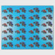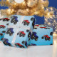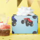 Papel de envoltura de cumpleaños de camión de monstruos con un camión rojo y azul sobre un fondo azul cielo. Encontrar diseños similares en otros elementos de cumpleaños en www.zazzle.co.uk/special_stationery