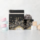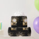 Nochevieja o el fiesta de Año Nuevo envuelto de regalo con oro en negro, con un reloj listo para la medianoche, champán y regalo. Dé un regalo a sus fiestas invitados o a su pareja con algo especial para celebrar el próximo año. Oro, negro, purpurina de oro.