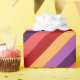 Un rollo de papel de envoltura con un motivo colorido de patrón de rayas diagonales en rojo cereza, rosa melón, violeta, púrpura de ciruela y amarillo banano.