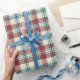 Un rollo de moda Giftwrap, con el patrón de verificación de las Madras Rojo, Beige y Azul Oscuro. Parte de la colección "Heffalumps" de Posh & Painterly.