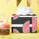 Cuidada acuarela verano sandía temática verano fiesta de regalo de cumpleaños envuelto papel rosa y verde sobre negro. Estilo caprichoso.