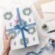 Elegante papel de envoltura ilustrado a mano con motivos de reno y Navidades con bayas, hojas y follaje eucalipto.