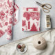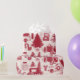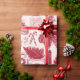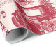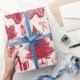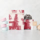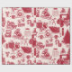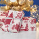 Diseño de toile rojo vintage con camionetas de camionetas, traslados, cestas de picnic, cacao caliente, patines de hielo y árboles de Navidad. Papel de embalaje perfecto para cualquier edad o género.