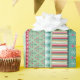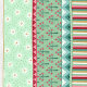 Alegre envoltura de regalo con un patrón de rayas Navidades lleno de estrellas, flora de invierno y corazones. Obra original de Marketa Stengl.