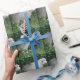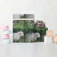 Este hermoso papel de envoltura muestra una fotografía de una bonita oveja esponjosa. La oveja está rodeada de flores silvestres y de hierba larga y se come codiosamente algunas hojas. Tiene un grueso abrigo blanco de lana y una nariz negra linda.