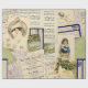 Collage temático de navidades de postales vintage, escritura a mano, partituras y etiquetas de envío en tonos más fríos y azules y verdes. Las imágenes incluyen a un chica con una bolsa de letras, una dama de calendario con un elegante gorra de plumas, y tarjetas de mistletoe y holly. También incluye la escritura francesa antigua y la portada del periódico francés "Le Petit Journal".