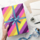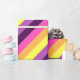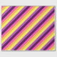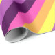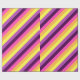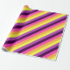 Un rollo de papel de envoltura con un diseño de patrón lindo y colorido de rayas diagonales en púrpura de ciruela, lavanda, amarillo limón, naranja de melón y magenta brillante.