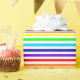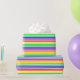 Papel envuelto con un diseño de franjas audaces. Los colores se alternan entre el blanco y el arco iris (rojo, naranja, amarillo, verde, azul, añil y violeta).