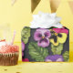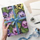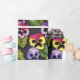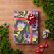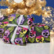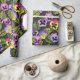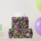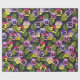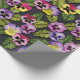 Este envoltorio de regalo tiene un diseño floral con paneles morados y amarillos sobre un fondo azul oscuro-gris, perfecto para cualquier jardinero o amante de las flores.