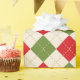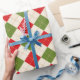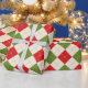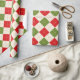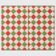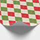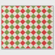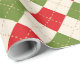 Este papel de envoltura festivo presenta un patrón de argyle rojo y verde sobre un fondo crema.