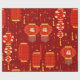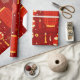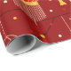 La imagen muestra un patrón impecable que celebra la atmósfera festiva del Año Nuevo Chino. El diseño está repleto de linternas rojas y doradas en diferentes formas tradicionales, decoradas con detalles intrincados como motivos florales, borlos y símbolos chinos de nudos. Algunos farolillos tienen personajes dorados como el símbolo chino para la "fortuna" (福), enfatizando temas de suerte y prosperidad. El producto incluye farolillos dispuestos en una composición superpuesta, conectados por delgadas cuerdas negras para imitar el aspecto de decoraciones colgantes durante las celebraciones de Año Nuevo chino. En el fondo se han repartido otros elementos como las monedas de oro, los borlos y los pequeños puntos blancos, rojos y dorados, lo que da un toque festivo y festivo. El rico fondo rojo simboliza la felicidad y la buena suerte, mientras que los acentos dorados agregan un elemento de elegancia y prosperidad. Este diseño es ideal para propósitos decorativos como papel de envoltura, decoración festiva o temas de eventos culturales.