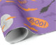 El "Halloween Wrapping Paper with Witch, Broom, Boo!" combina brujas voladoras, cielos nublados y lunas brillantes, con "boo" esparcido por todas partes, perfecto para agregar un toque espeluznante y juguetón a los regalos de Halloween.