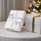 Un reno de cristal pintado a mano decora este Navidad único y moderno envuelto en un elegante patrón vacacional