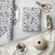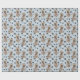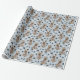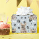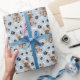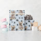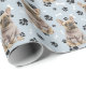Una imagen de un pequeño Bulldog francés marrón en un suéter de invierno marrón es la característica del patrón en este papel de envolver de regalo para todas las ocasiones. El perro se sienta en medio de un patrón de huellas de pata negra y huesos blancos, y se repite en un fondo azul plateado.