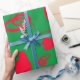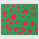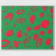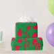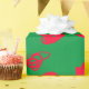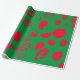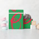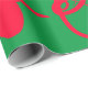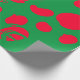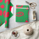Este papel de envolvimiento festivo muestra líneas curvadas y formas en rojo sobre una superficie verde.