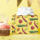 Un peri-peri, friggitello, habanero, rocoto, jwala y shishito chili pimienta están decorados con patrones de la región donde originalmente se cultivaban o comían comúnmente y se sientan en un fondo amarillo con patrones inspirados en los tatuajes usados por los pueblos nativos en el Amazonas para crear un divertido patrón repetitivo que refleja los orígenes y la difusión de estas deliciosas frutas, y a menudo picantes.