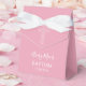 Esta elegante y bonito caja de favores del partido Bautismo (o Cristianismo) presenta una cruz blanca ilustrada para coincidir con la cinta de acento blanco. El color de fondo es rosa, pero puede cambiarse a cualquier color que desee. El nombre y la fecha del evento del niño se pueden personalizar para su celebración religiosa. Una adición perfecta a la reunión especial de una niña. También hay invitaciones coincidentes.