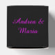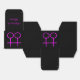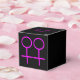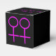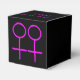 Esta impresionante caja de favores está diseñada para lesbianas. Cuenta con dos símbolos femeninos rosados uno al lado del otro. El fondo es negro. Hay un texto de personalizable en la parte superior de la caja para poner los nombres de la pareja feliz.