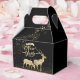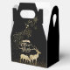 fondo negro con estrellas doradas y feliz año nuevo con animal navideño dorado.