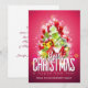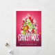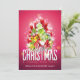 Una tarjeta de vacaciones de Navidad plana personalizada con tu nombre y mensaje en la parte posterior. Diseñada con una ilustración fresca de Navidad. El texto dice Feliz Navidad y Feliz Año Nuevo. Diseñada con una pila en forma de árbol de regalos con copos de nieve festivos, estrellas, adornos de Navidad y destellos brillantes. El fondo es de un vibrante color rosa rojizo.