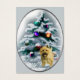 Exquisito arte navideño con un adorable cairn terrier parado frente a un árbol de Navidad lleno de nieve, decorado con adornos que parecen brillar a la luz de la luna. Maravillosos regalos para los amantes del cairn terrier.