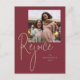 ¡Celebremos y regocijémonos! Estas tarjetas de Navidades religiosos de 5"x7" muestran el saludo, "Regocijo", en letras doradas sobre un fondo burdeos con un punto para insertar tu foto favorita. Foto de loly galina en Unsplash