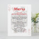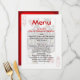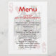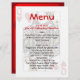 Alicia caprichosa en menú temático de la recepción nupcial del país de las maravillas. Los gráficos hacia fuera descolorada de una reina del naipe de los corazones adornan el fondo, con el texto rojo y negro de encargo listo para personalizar para su boda. La parte posterior del menú se hace en rojo, con los gráficos de todos los juegos. Menú caprichoso del boda grande para los bodas de Vegas también.