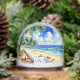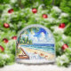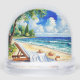 Hermosa escena de playa con una tumbona con una manta y gorras de paja cerca de las olas del océano, enmarcada por árboles verdes y un vibrante cielo abierto, que retrata la serenidad de la relajación y las vibraciones de verano.
