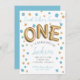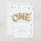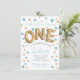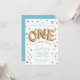 ¡Mira quién se está volviendo uno! Relieve metalizado dorado moderno Balón Primer cumpleaños invitaciones de fiesta con confeti azul y oro. ¡Genial que un bebé se vuelva uno! El aspecto limpio y moderno tiene un gran toque fiesta. Relieve metalizado azul y oro falso.