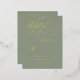 Esta romántica tarjeta RSVP verde de sabio Relieve metalizado dorado es perfecta para un boda sencillo. El moderno diseño clásico se caracteriza por sus llamativos remolinos y su espléndida y elegante decoración con Relieve metalizado dorado y tipografía prensada a mano sobre un polvoriento fondo verde sabio.