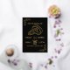 Invitación de boda elegante con foil dorado y negro. Un marco dorado ornamentado y adornos decoran un fondo negro oscuro elegante para un efecto dramático