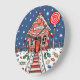 Un ilustracion colorido de una casa de jengibre festiva. El exterior de la casa está decorado con dos latas de caramelo y tiene un gran árbol de langosta en el jardín. El suelo está cubierto de una brillante nieve de azúcar blanca de hielo y repleto de dulces.