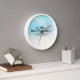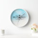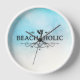 Reloj de pared con acuarela de playa, agua, arena y la palabra "beachaholic" con acento decorativo y chanclas.