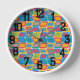 Este reloj de pared tiene un diseño moderno de mediados de siglo de colores brillantes que hacen rectángulos redondeados con otros rectángulos dentro formados por una colección de líneas.