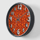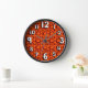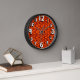 Este reloj de pared tiene un diseño moderno de mediados de siglo con rectángulos redondeados de color burdeos conectados entre sí sobre un fondo naranja.