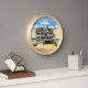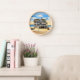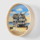 Reloj en un ilustracion de una casa de playa idílica sobre pilotes frente al océano tranquilo, con un pequeño barco a orillas de arena. El cielo es luminoso y parcialmente nublado, lo que añade un ambiente costero sereno.